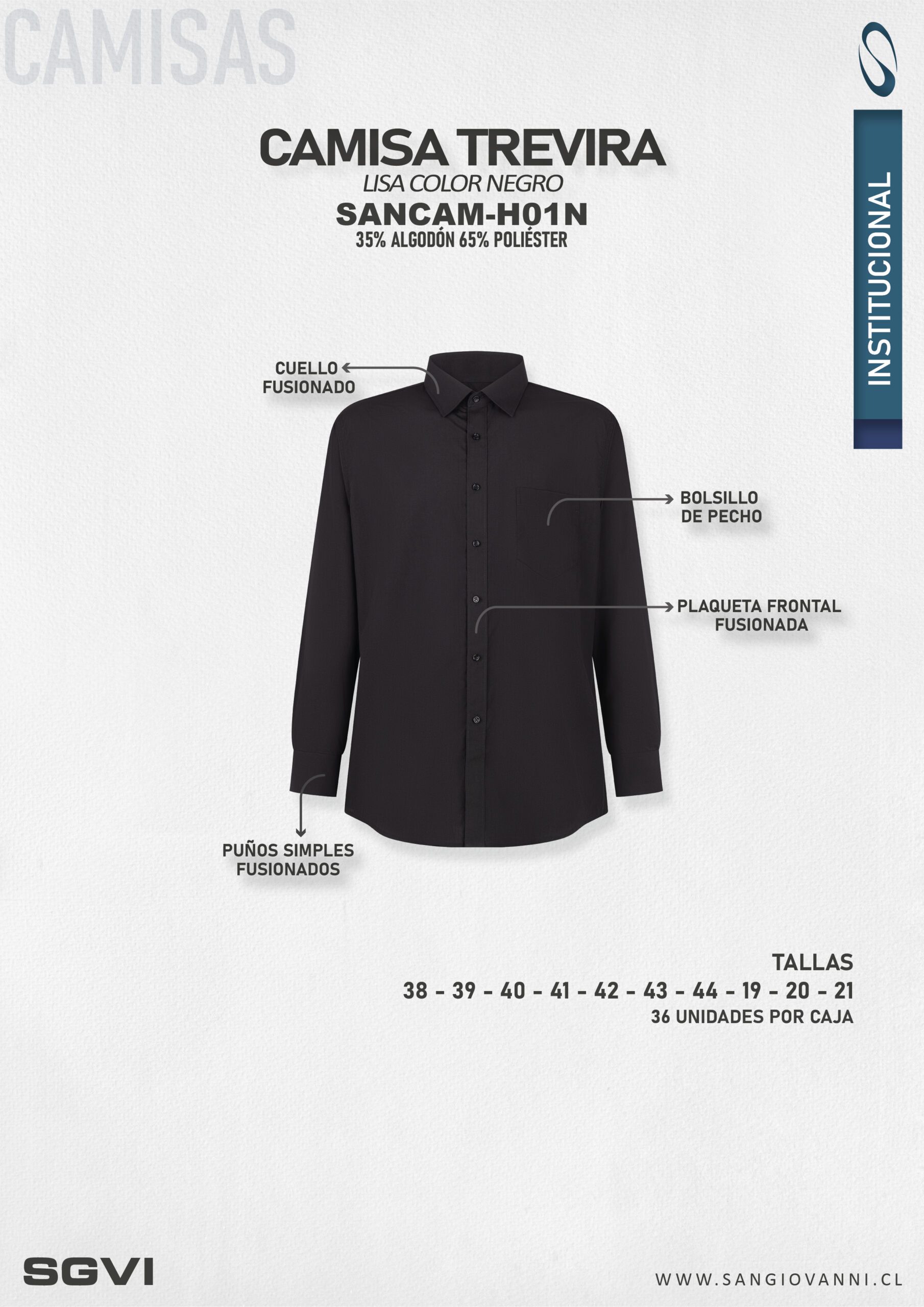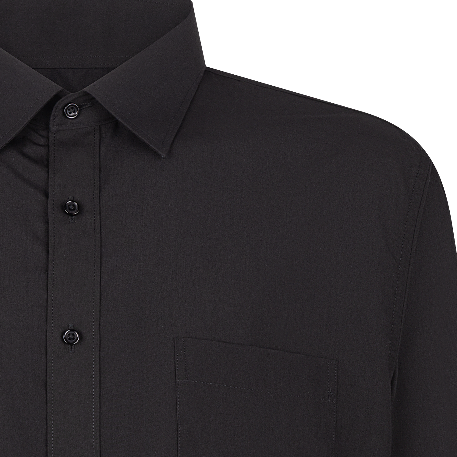 Camisa de hombre de corte clásico y manga larga, confeccionada en resistente tela Trevira de color negro liso, ideal para uso corporativo, uniforme o vestuario formal.