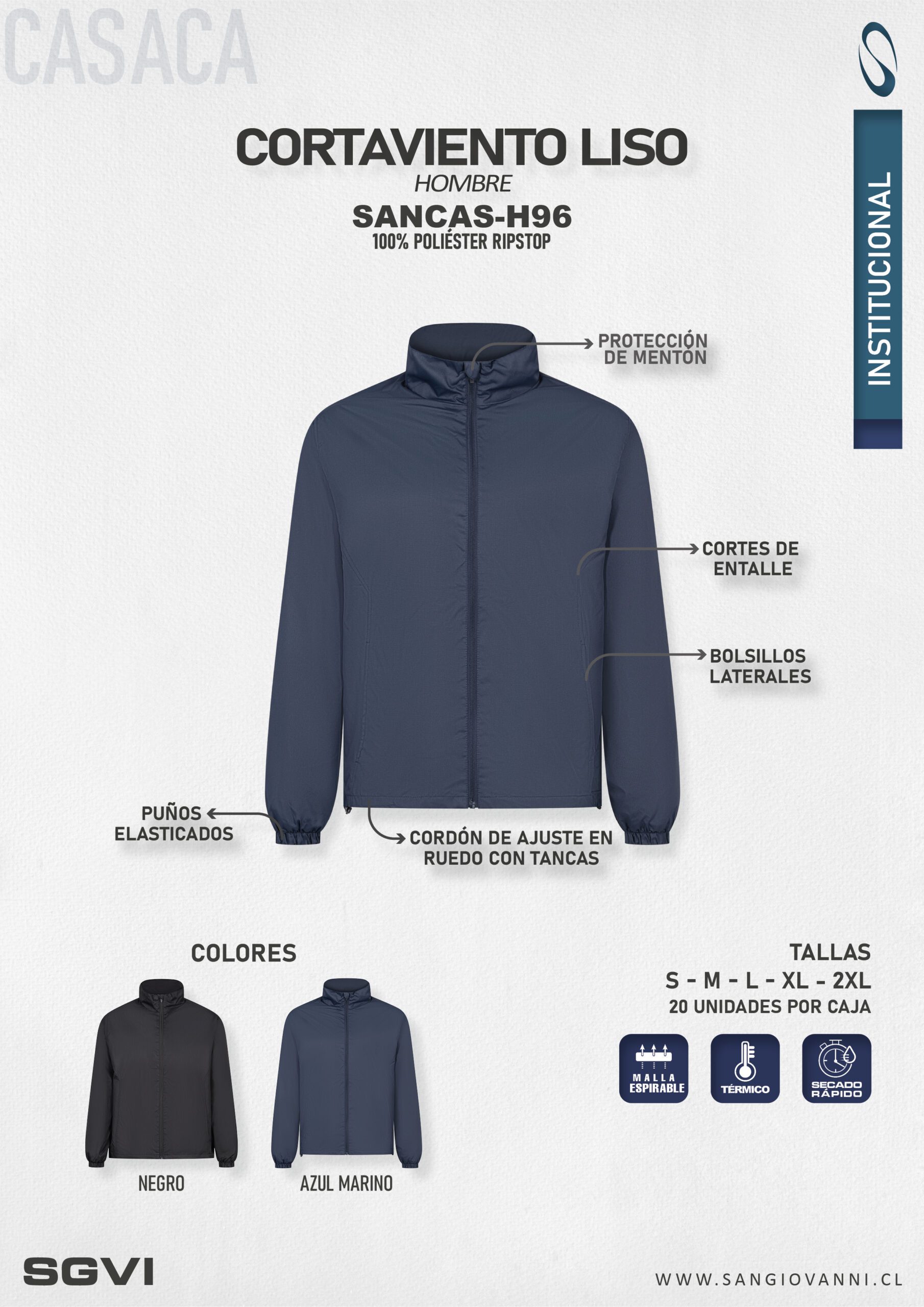 Cortavientos de hombre liviano, incorpora cuello alto con pieza de protección para la barbilla, entregando mayor comodidad y protección frente a condiciones climáticas cambiantes.