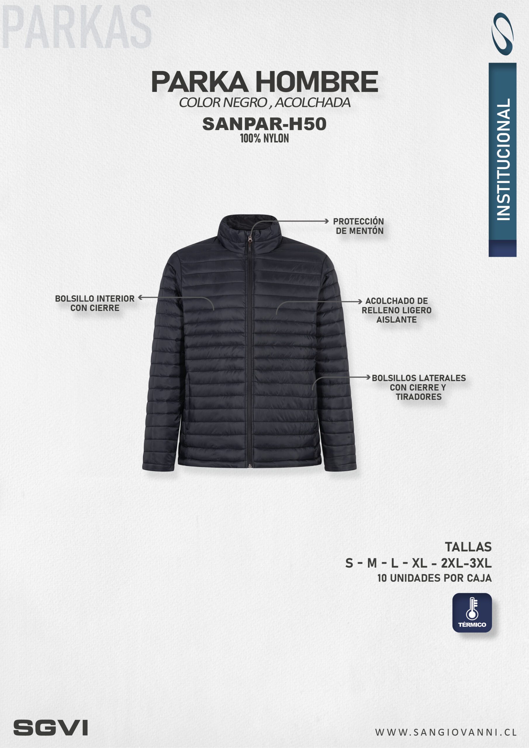 Parka de hombre acolchada y térmica, diseñada para brindar abrigo y comodidad en climas fríos. Cuenta con cuello alto y capucha desmontable, permitiendo adaptar la prenda según las condiciones climáticas y el uso diario.