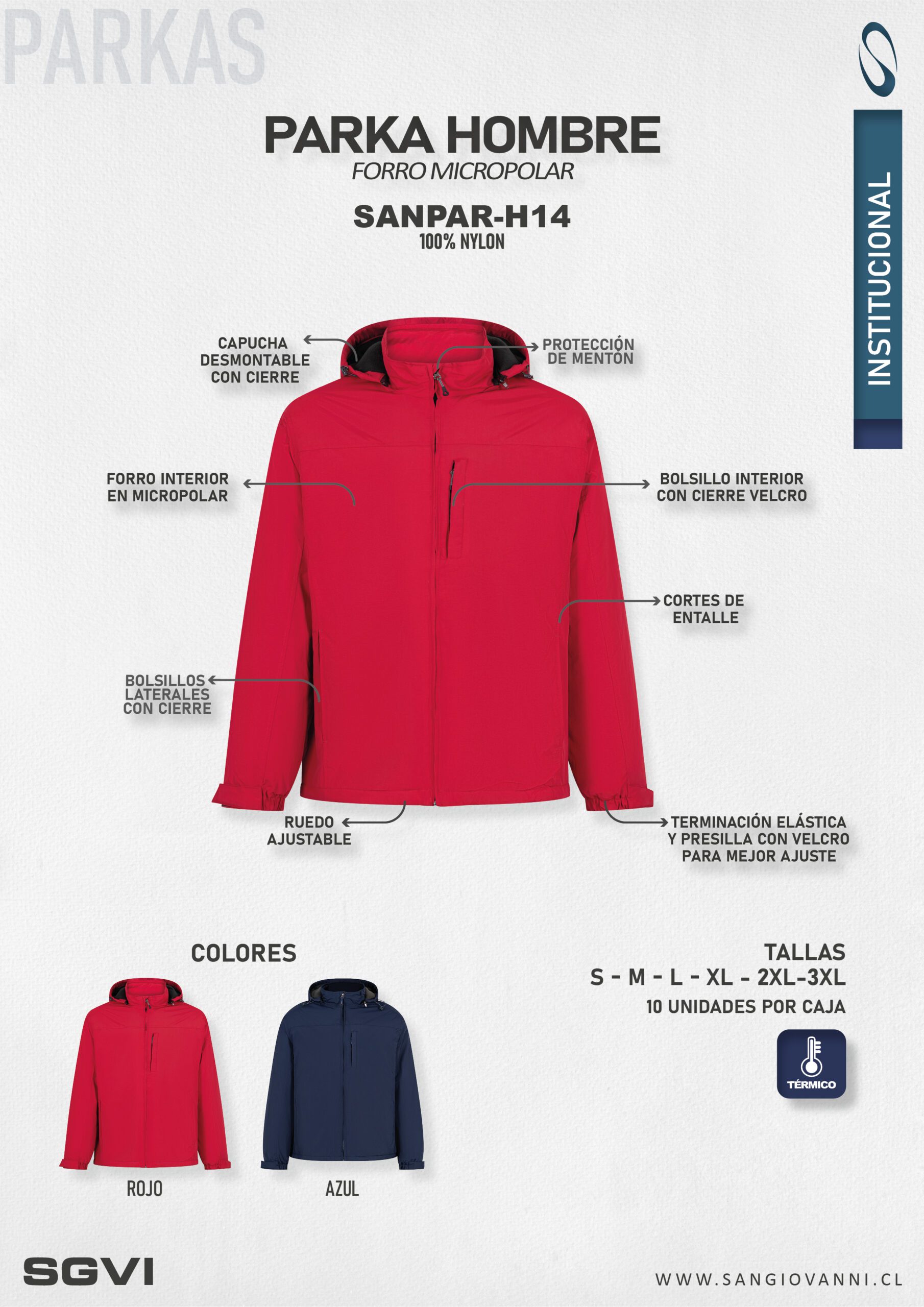 Presenta cuello alto y capucha desmontable, ofreciendo versatilidad según condiciones climáticas. Incluye bolsillo en pecho con cierre de seguridad para resguardar objetos personales de manera práctica.
