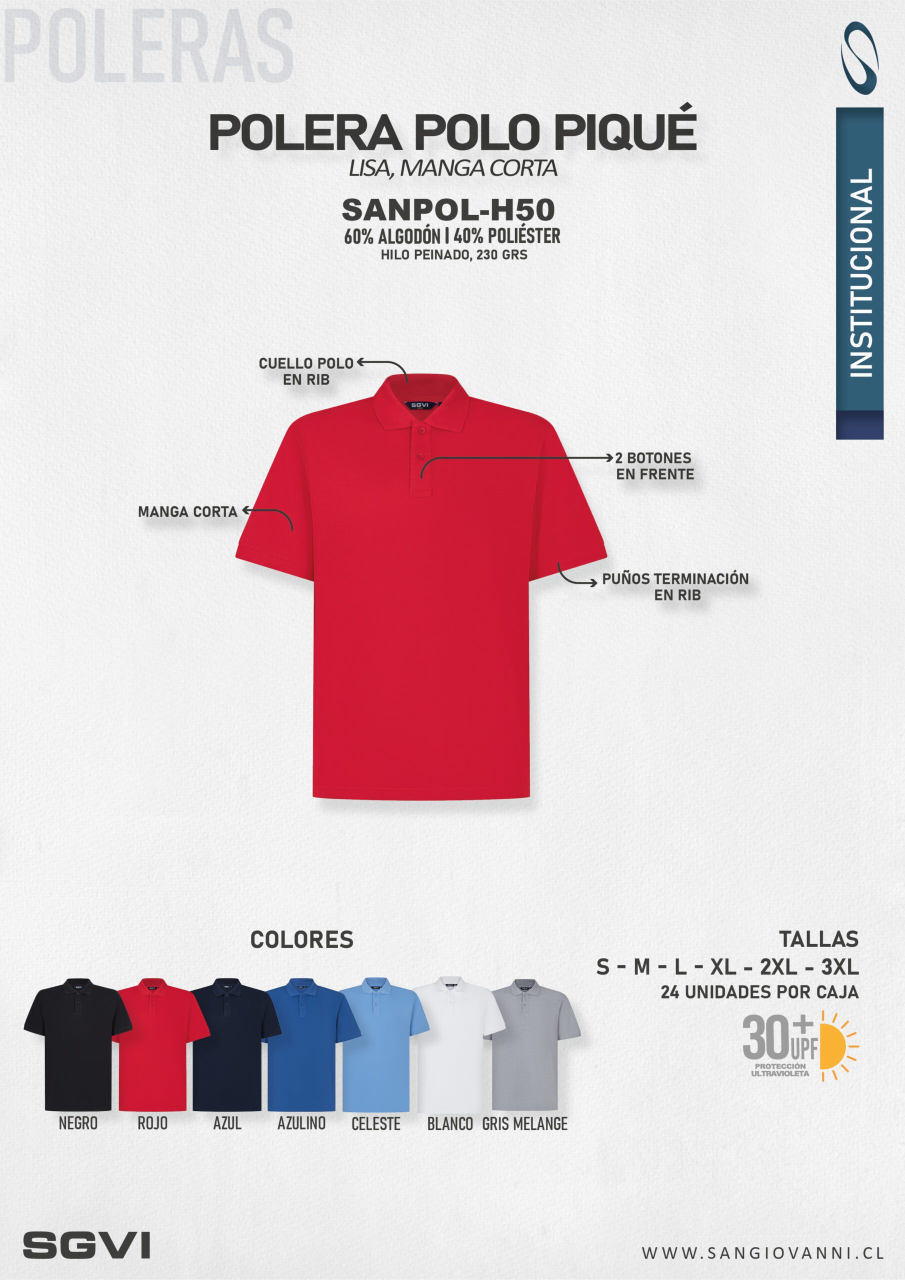 Polera tipo polo confeccionada en tela piqué de hilo premium peinado, que ofrece mayor suavidad, mejor terminación y mayor durabilidad. Diseño de manga corta y color liso.